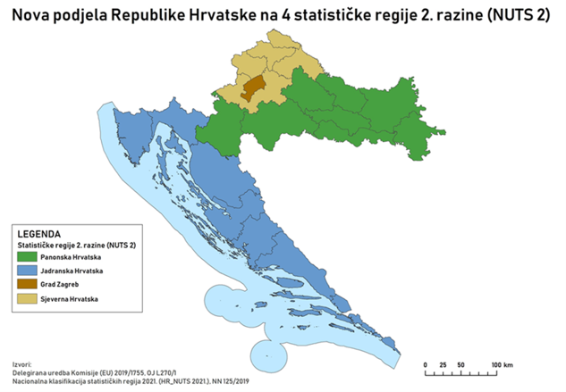 Od 1. siječnja 2022. god. prema europskoj „Nomenklaturi prostornih jedinica za statistiku- NUTS“  Hrvatska je podijeljena na četiri regije: