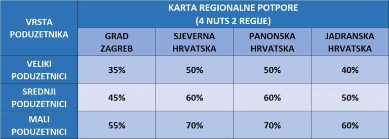 Intenzitet potpore tako se s dosadašnjih 25% povećava na 50% za Panonsku i Sjevernu Hrvatsku te na 40% za Jadransku odnosno 35% za regiju Grad Zagreb.